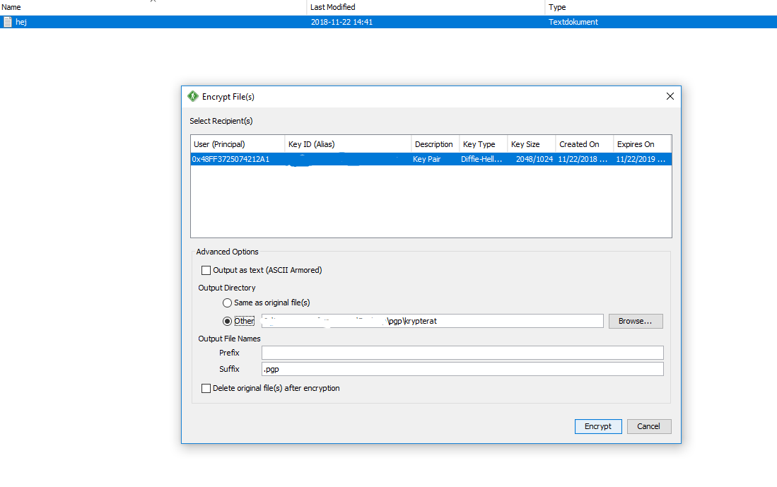 Den krypterade filen hamnar i katalogen krypterat.